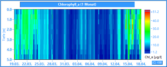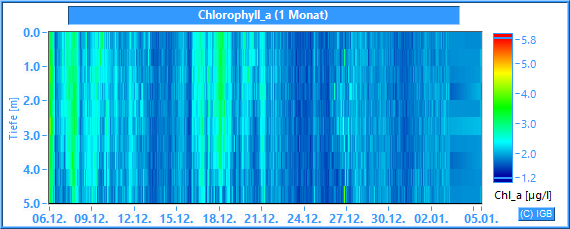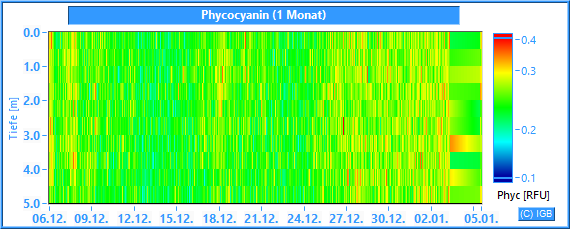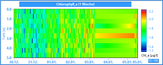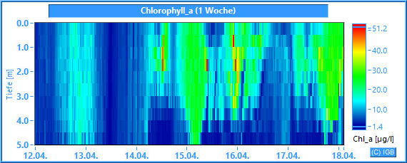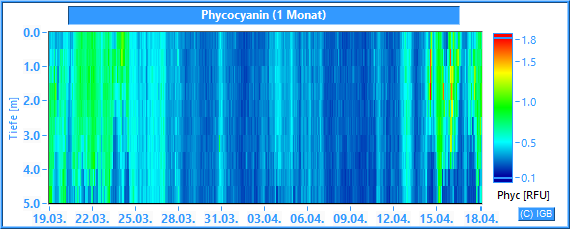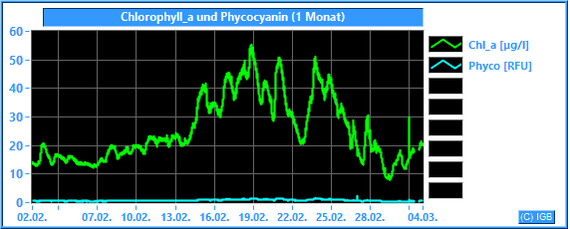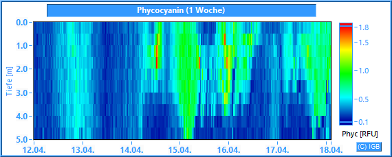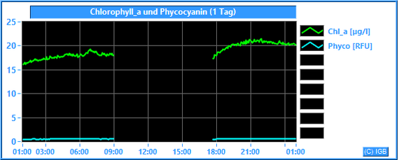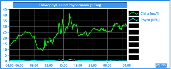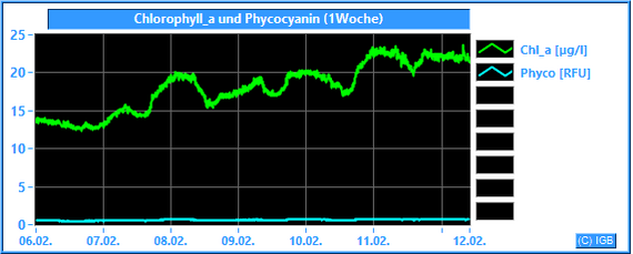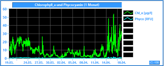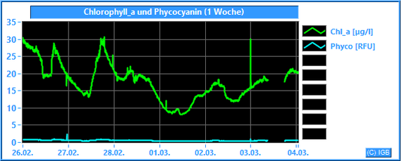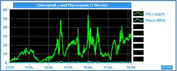 Chlorophyll_a wird in µg/l und Phycocyanin in relative Fluoreszenzeinheiten (RFU) mit der Multiparameter-Sonde EXO2 von YSI in ca. 1.5 m Tiefe gemessen.