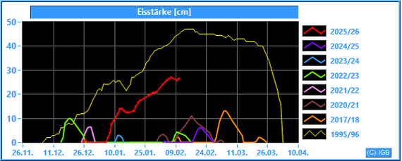 Bitte unbedingt die Nutzungsbedingungen beachten! Die Messung der Eisstärke erfolgt, soweit möglich, einmal täglich.Die Winter 2018/19 und 2019/20 waren eisfrei.
