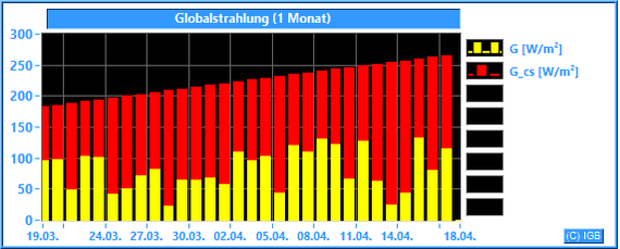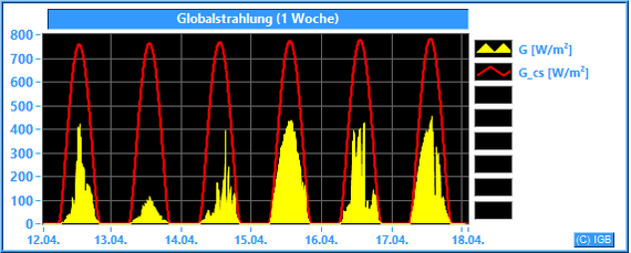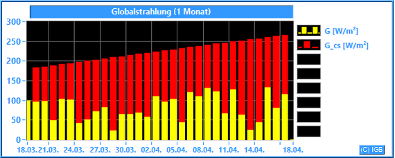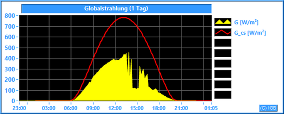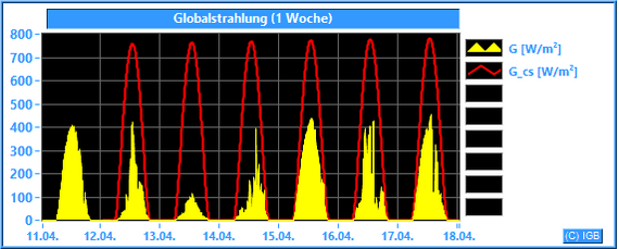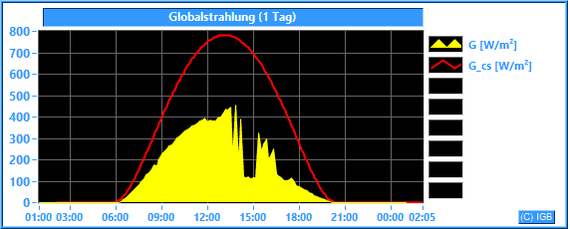 Die Sonnenstrahlung hat an der Erdoberfläche eine Wellenlänge zwischen etwa 200 und 3000 nm. Im Mittel dringt nur knapp die Hälfte der gesamten Sonnenstrahlung durch die Erdatmosphäre, an wolkigen Tagen natürlich weniger. Unser Albedometer misst die Stärke der Strahlung mit Wellenlängen zwischen 300 und 2900 nm. Dabei wird die Bestrahlungsstärke in W/m² angegeben. Nur der Spektralbereich zwischen 400 und 780 nm ist für den Menschen sichtbar. Er hat einen Anteil von etwa 45 % an der gemessenen Globalstrahlung. Die Pflanzen können einen Teil des sichtbaren Lichtes photosynthetisch nutzen. Der größte Teil der Globalstrahlung wird beim Durchdringen von Luft und Wasser in Wärme umgewandelt. Dargestellt wird die gemessene Globalstrahlung (G) im Vergleich zur errechneten Globalstrahlung (G_cs), die bei wolkenlosem Himmel und einer jahresdurchschnittlichen atmosphärischen Trübung (Linke-Trübungsfaktor = 3) erreicht werden kann.