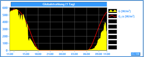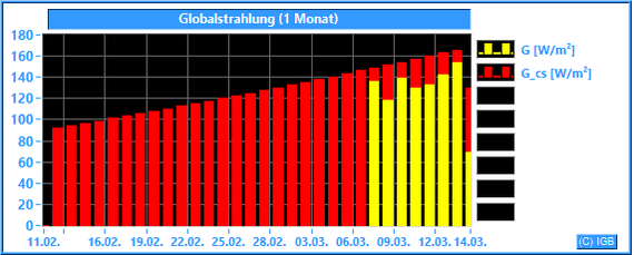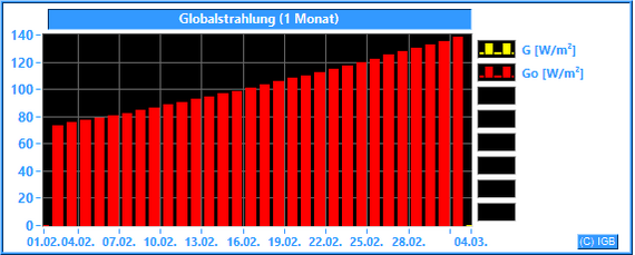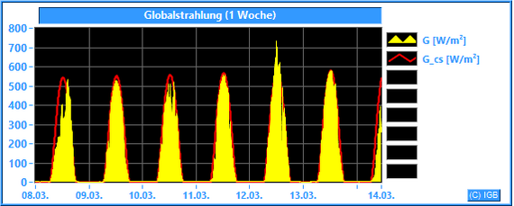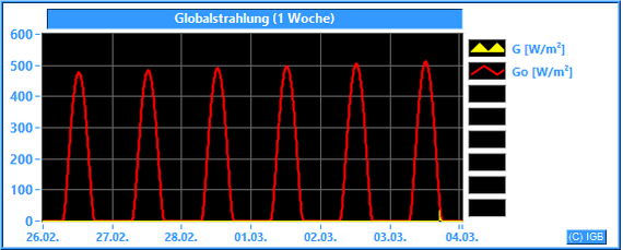 Die Sonnenstrahlung hat an der Erdoberfläche eine Wellenlänge zwischen etwa 200 und 3000 nm. Im Mittel dringt nur knapp die Hälfte der gesamten Sonnenstrahlung durch die Erdatmosphäre, an wolkigen Tagen natürlich weniger. Unser Albedometer misst die Stärke der Strahlung mit Wellenlängen zwischen 300 und 2900 nm. Dabei wird die Bestrahlungsstärke in W/m² angegeben. Nur der Spektralbereich zwischen 400 und 780 nm ist für den Menschen sichtbar. Er hat einen Anteil von etwa 45 % an der gemessenen Globalstrahlung. Die Pflanzen können einen Teil des sichtbaren Lichtes photosynthetisch nutzen. Der größte Teil der Globalstrahlung wird beim Durchdringen von Luft und Wasser in Wärme umgewandelt. Dargestellt wird die gemessene Globalstrahlung (G) im Vergleich zur errechneten Globalstrahlung (Go), die bei wolkenlosem Himmel und einer jahresdurchschnittlichen atmosphärischen Trübung (Linke-Trübungsfaktor = 3.0) erreicht werden kann.