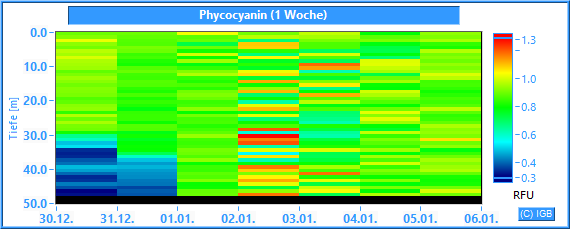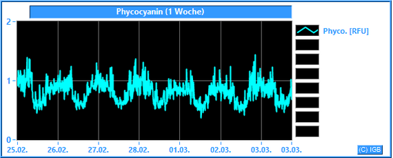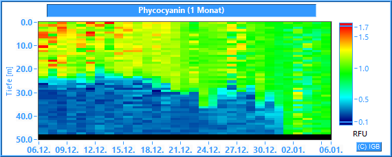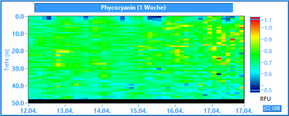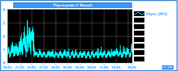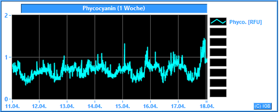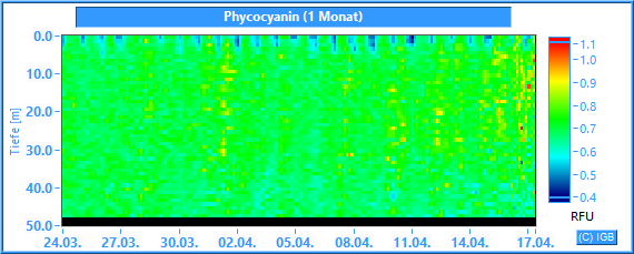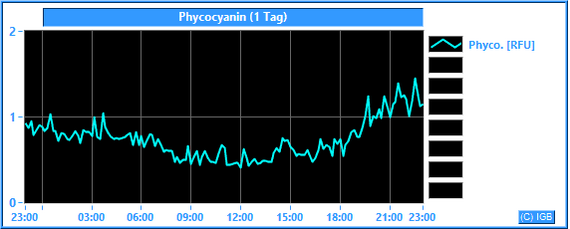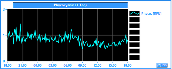 Phycocyanin wird in relative Fluoreszenzeinheiten (RFU) mit einer Sonde von YSI in ca. 2 m Tiefe gemessen.