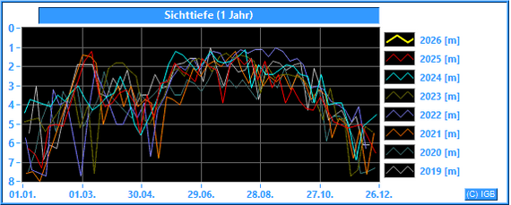 Eine weiße Scheibe von 25 cm Durchmesser kann man bis in eine Tiefe sehen, in der etwa 10 % des Oberflächenlichtes ankommen (Sichttiefe). "Verschluckt" wird das Licht im Müggelsee insbesondere durch mikroskopisch kleine Algen, das Phytoplankton. Je mehr Algen, desto trüber das Wasser. Die Messung der Attenuation ist nur bei Tageslicht möglich. Wenn das Licht nicht ausreicht, wird kein neuer Messwert angegeben.