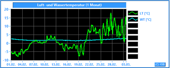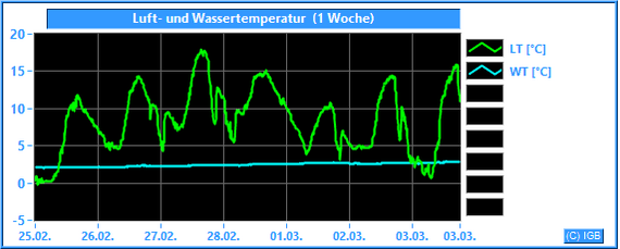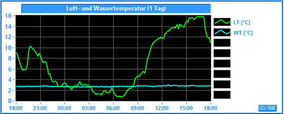 Die Lufttemperatur wird als Mittelwert in ca. 3 m über dem Wasser in °C gemessen. Die Wassertemperatur wird in ca. 2 m Wassertiefe in °C gemessen.